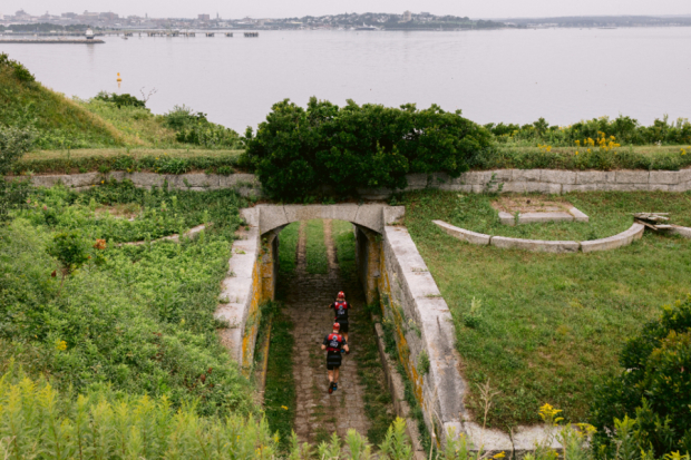 Once onto House Island teams ran across the Fortland property past some newly constructed yurts, camping tents and through the fortress grounds of Fort Scammel with downtown Portland on the skyline in front of them.