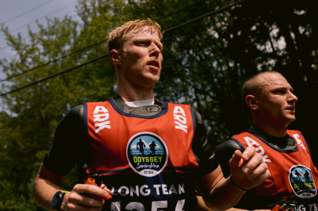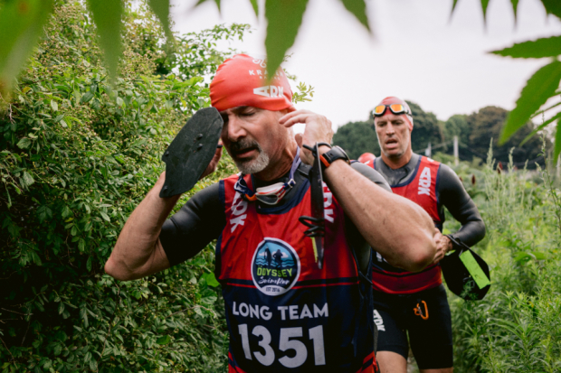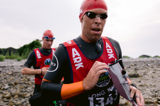 Long Course athletes completed 22 total miles covering 10 islands. 17 total miles of running and 5 total miles of open water swimming. Marcus Barton fully concentrated putting on his swim cap while negotiating a trail section taking athletes down to the water with his Swaggy Zaddys teammate Lee Greene sitting just off his shoulder.