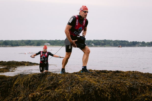 Greg Dierksen of the Boston Wet Sox powers up a pile of slippery seaweed onto House Island while Bronwen tries to keep her footing. The husband and wife duo went on to cross the finish line as the first placed Mixed Team but were also the overall fastest team on the day.