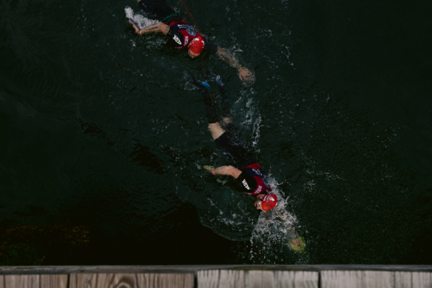 Chris Douglas and Chipper Nicodemus swim under the ferry dock at Little Diamond Island, a legal shortcut recommended by Race Director John Stevens, who spends much of his summer on the island. Chris and Chipper are the hosts of the swimrun podcast The Low Tide Boyz.
