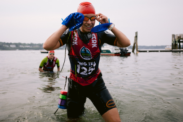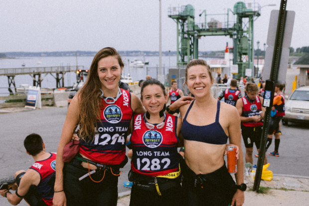 Three of the most experienced and fastest swimrun women in the US were in the Long Course field at Casco Bay. Bronwen Price-Dierksen of the mixed team Boston Wet Sox flanked by Team First Date’s Aryn Marsh and Caroline Wolek before getting down to business.