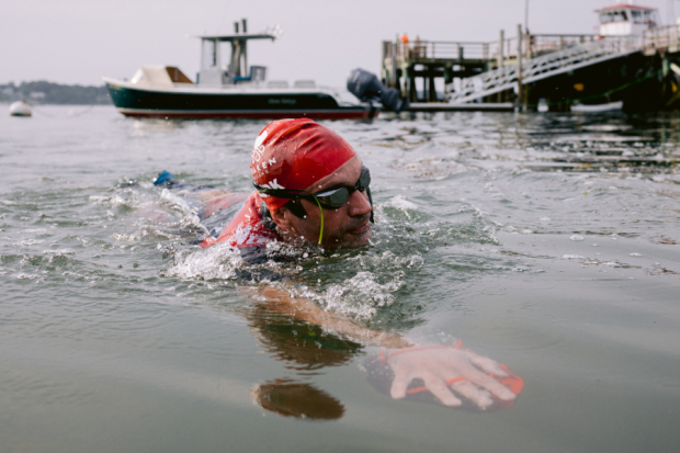 An athlete navigates the best line to the exit of the longest swim of the day between House and Little Diamond.