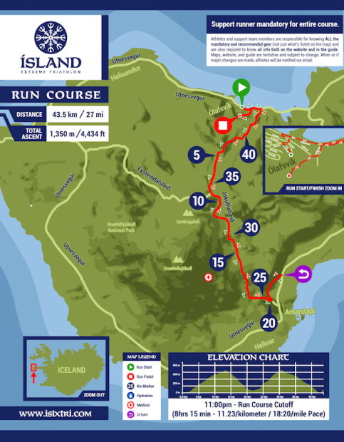 The course is an out and back that goes up and over the Snæfellsjökull Mountain to the town of Arnarstapi before returning back over the mountain.