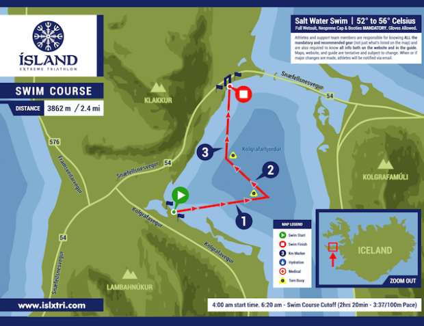 Those tackling an extreme triathlon are well aware that most organizers ask athletes to have a flexible mindset. The water is often cold, and combined with the likelihood of inhospitable weather, courses are often modified (though not necessarily shortened) to keep athletes safe. The 2.4-mile saltwater swim takes place in not-easy-to-say Kolgrafartjördur Cove.