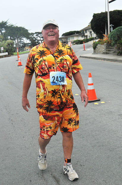 Number 2430 Sprint distance age grouper’s spirits are high. His fashion sense exuberantly tropical, insouciantly dismissive of the aerodynamic and wicking qualities of his spandex-free attire.