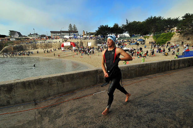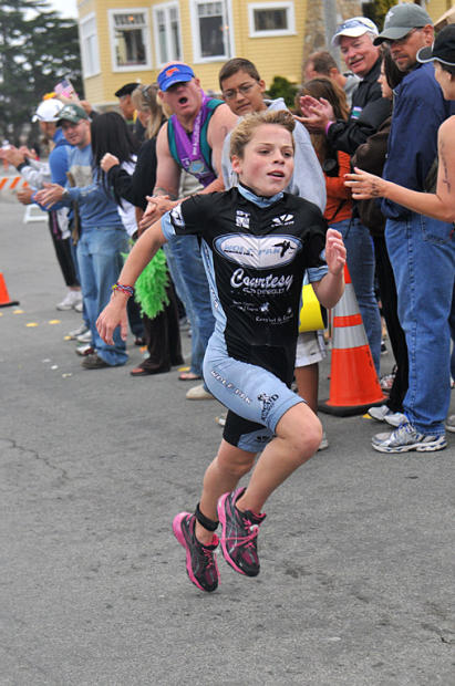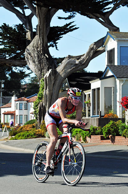 Terry Davis and his Tri-California organization started holding events in this community, just a few blocks south of the famed Monterey Aquarium and Cannery Row, in 1996. This past weekend was the 15th Triathlon at Pacific Grove. Perhaps you’ve heard it was beautiful. But it’s one very lesser thing to read about it than to experience the heartbreaking beauty of this place live and in person. The turquoise waters decorated with wine dark kelp and framed by the jagged rocky shoreline, ringed in iceplant and cypress trees, dominates the swim of course. But it also provides a welcoming backdrop as the bike heads south toward Spanish Bay, and makes the run that heads north toward Monterey along the shore an equally perfect picture. All the action whizzes past beautiful 19th century Craftsmen wood shingled houses, Spanish-style stucco homes covered in passionate red bougainvillea and cactus, blending seamlessly with tasteful modern homes whose skylights and wide windows embrace the outdoors.