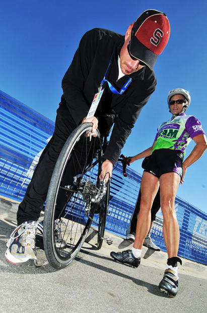 A Team in Training competitor has her flat tire pumped up.