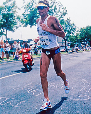 But Scott’s encore second place finish to Greg Welch at Kona in 1994 at age 40 and his fifth place finish there in 1996 at the age of 42 were signs that his drive for excellence transcended the usual boundaries of age and decline. Just to look at Scott’s tanned form-follows-function physique in those years and you wished that the ancient artists who created the Greek friezes depicting the classic lines of the original Olympic athletes could be called back to memorialize Scott.