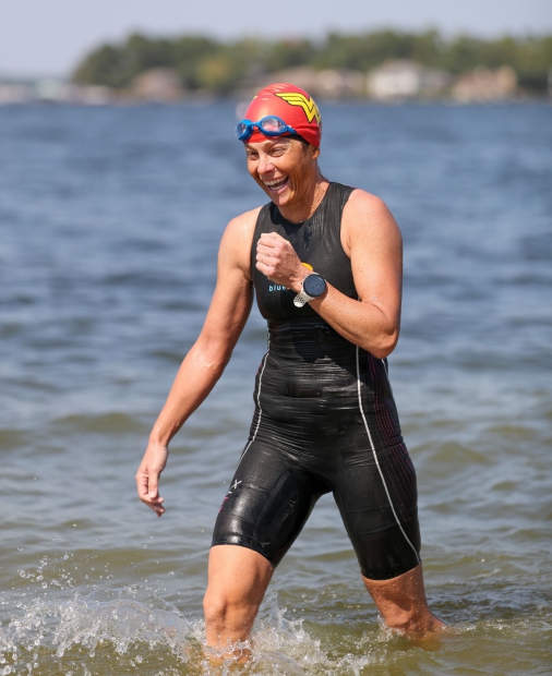 Though Roberts finished the 10km swim leg in 3 hours, 23 minutes and 50 seconds well outside of the mark, she was still smiling and laced up her shoes to tackle the marathon.