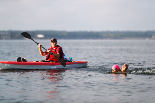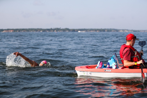 Daerr and his kayaker deployed excellent positioning strategy for much of the swim allowing Daerr to conserve as much energy as possible.