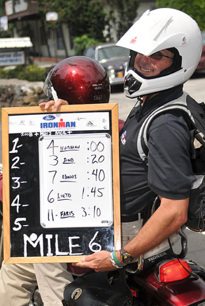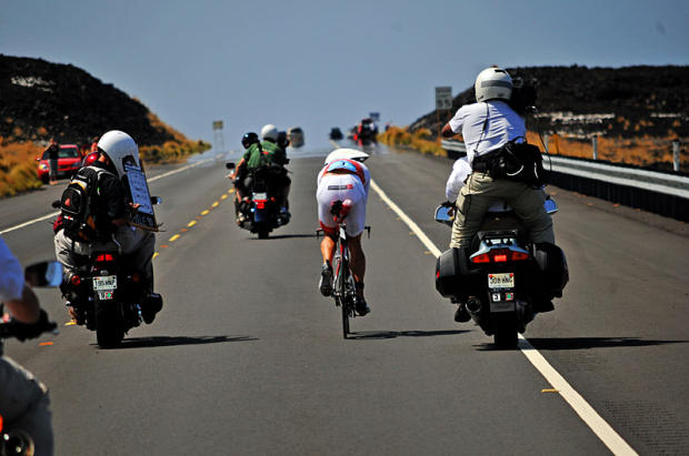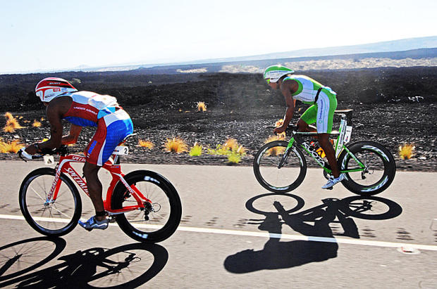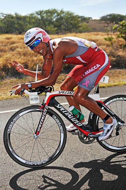Defending champion Chris McCormack signals something wrong with his bike on the climb to Hawi. A few miles later, he dropped out.