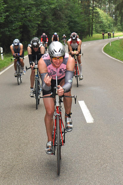 An age grouper salutes the happy crowd in an otherwise quiet village along the bike course.