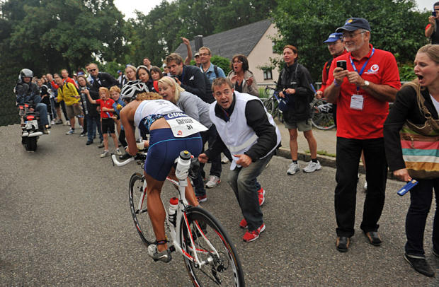 Roth’s passion stems from the Walchshofer family. Here race director Felix and his sister Katherine, a fellow Challenge race executive, whoop and holler encouragement to record-breaking Chrissie Wellington on Solarerberg.