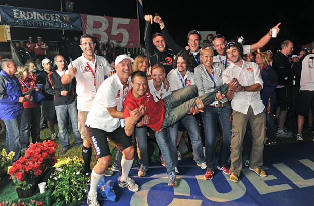 Team Challenge staff, including sister Katherine, hold up race director Felix Walchshofer when the fireworks signaled the end of the magic.
