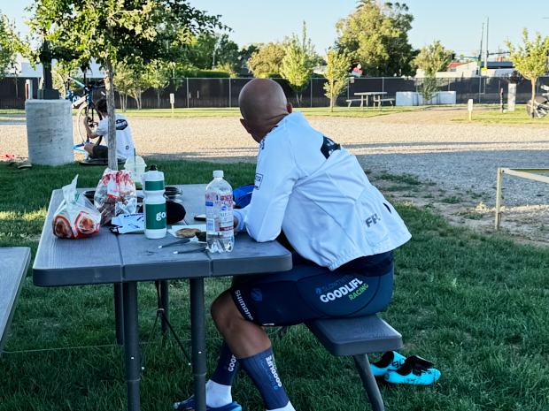 While the oil change happened, I got Dede a Slurpee, and she and I got caught up. The rest of the crew headed to an RV park where we would let the athletes sleep until they wanted to start moving again. The oil change was done quickly, and Jordan was able to start cooking an authentic meal for everyone. Shane began to walk around with his bibs on. (3 hours prior, he was throwing up like a crazy person) I was like. Oh, are we moving? We got to start sometime, he said. I looked at our medical director, who gave the thumbs up, and we began to prep the following vehicle.
