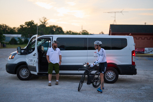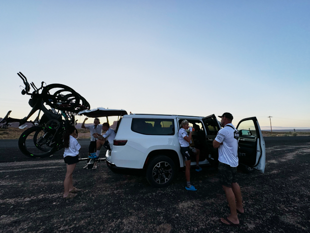 The rules allow for “one follow vehicle” that can swap out when approved. This meant that every time the GROUPs switched, they needed to swap out most everything in the following vehicle. Which meant our shuttle van needed to be present for that. It was filled with the new riders and all their gear. During the day, that was easy because you were allowed to leapfrog (most of the time), which meant the following vehicle could let the rider go and then catch up. So, the shuttle van would show up to the switch-off spot, get the rider out, and have them ready to tag team the rider coming in. Once the tag had happened, the whole crew would swap out stuff, and the new riders and crew were in the following vehicle and the old riders where in the shuttle van and off to the RV and/or Hotel for some rest.