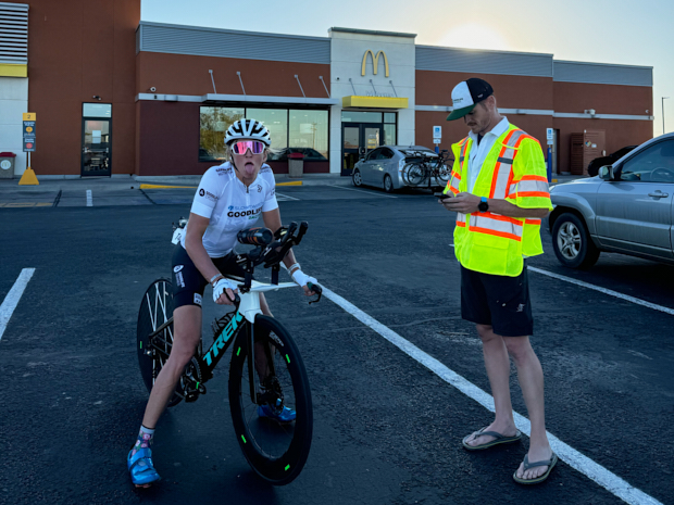 During that time, the riders continued to fly, and the crew continued to play catch up. The generator in the RV wasn’t working perfectly, so we couldn’t make meals, and we were forced to rely heavily on the RV’s front AC unit instead of the two substantial overhead units. It was working, but not really (did I tell you the fridge broke the day we arrived in Oceanside). We had just picked up our last crew member “Spoon” in Flagstaff, and the first thing he did was get the generator working again (sort of), but because of this CLUSTER F@#$ going on in the background, we were still making game-day decisions that needed to be made. For example, Group B at 7:40 pm stopped at McDonald’s, which took about 10 mins. We were about an hour past our allotted 4-hour “Pull Time,” and the athletes needed REAL food. It was past 7 pm, so the follow vehicle wasn’t allowed to play leapfrog, so that meant we all needed to stop. So, I assumed 10 minutes was better than an hour-long penalty. The other reason for the stop was we were in a complete DEAD zone. Our phones didn’t work, and our radios also had ZERO LTE service; we were getting ready to enter the deep parts of the Navajo Nation, one of the most scenic sites I have seen. It’s also the most nerve-racking place to be at night; the fewer stops after dark, the better. During the pass-off, the tension was high for some, and others enjoyed the sunset with a Big Mac.