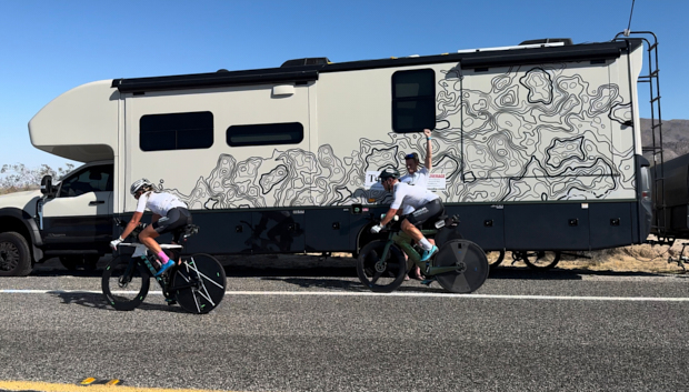 Group A are already night owls, so they took the 11-3 pm and 7-3 am ride times. While Group B took the 3 am-11 am and 3 pm-7 pm shifts. This allowed for 8 hours on,4 hours off, 4 hours on, and then 8 hours off. Because RVs aren’t allowed to be the following vehicle, we set up the following vehicle (Ford 350 low-height transit cargo van) to be the following vehicle, and we chose to make it the “Home away from Home” during the team's “on” time slots. The riders decided to have their bikes inside the van instead of outside on racks. This was so they could keep bikes out of the weather and allow the mechanics to work on a bike during the nighttime when the “Direct Follow” was in place from 7 pm-7 am. I wouldn’t say I liked this idea because I wouldn’t say I liked the lack of space it gave the riders for proper rest, but in the end, the riders had to be in the back of the van, not me.