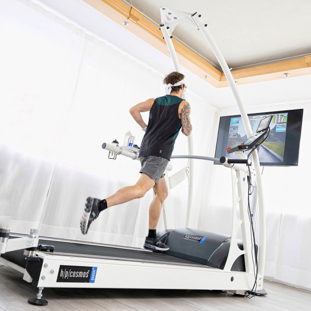 Florian: It is a HP Cosmos Quasar. The company is here nearby, and I was lucky to train all the time on it. The company builds professional treadmills for medical and professional sports stuff. They can also build a treadmill where you can do cross-country skiing on it. Crazy. Very accurate and calibrated so it is like running outdoors on a track. Very good stability and it feels real realistic and you can run so fast on them.