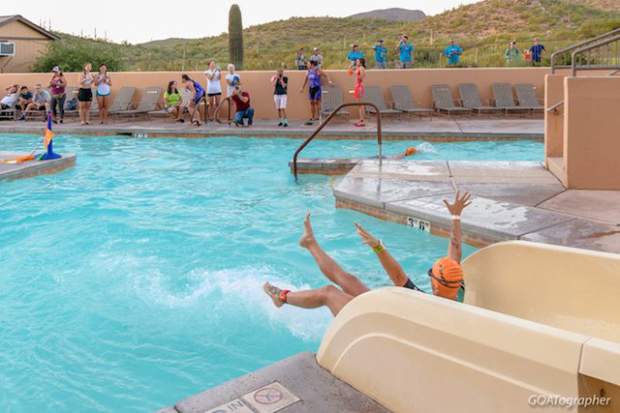 It starts with a time trial start down a waterslide into 3 to 5 minute swim against a gentle current in the resort’s Lazy River. The individuals and teams then mount run-what-you-brung bikes including laid back beach cruisers and bikes with training wheels and tassels on a 3.6-mile bike trek on well paved gently rolling roads. It concludes with a one-mile walk, trot or canter along beautiful Marriott trails framed by Saguaro cacti leading to a catered post-race fest.