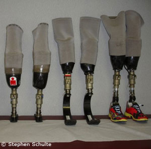I have been the tip of the sword in term of double amputees and what can be done in our sport. Hopefully, my failures and setbacks can be use to help others like me be more successful. I am currently riding a bike that is about 3 sizes to small. I have been working with Eddie O'Dea of 55nine Performance on my bike fit and cycling technique. He has worked with me to setup my bike optimally using the Wobble-Naught fit system and quantified the setup based on my skeletal and prosthetic measurements. This has to be refined every time my prosthetics change. We are using the Dartfish video analysis to constantly work on my form and technique which has resulted in more comfort and some of my best bike splits to date. There have been some major challenges with getting into an aero position mostly due to balance or lack there of, so we are still working in that area. I am seeking a bike sponsor for 2009 season that could work with us so that we can progress to a stable aero position.