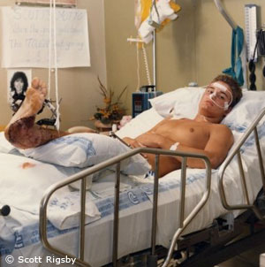 struck and my dreams were shattered. I had just graduated from high school and was riding down a country road in the back of a pickup truck with my three best friends. Our truck was towing a trailer full of lawn mowers. A driver of an 18-wheeler who had been following us for 10 miles became impatient and tried to pass us on a double yellow lined, two-lane road with a very narrow bridges ahead. As the 18-wheeler went by, it hit our flat bed trailer. Before I knew what was happening, I found myself thrown from the truck and clinging to the side of the pickup. I slipped off and was dragged 324 feet on the hot Georgia asphalt when one of my legs became pinned in a brace between the tires of our 3-ton trailer of lawn mowers.