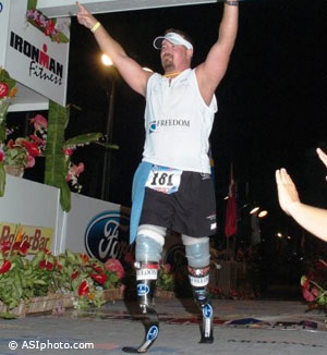 Scott: No, but in fairness to all your able bodied readers, I don't know what they go through either. I can walk in everyone of your reader's shoes because I can choose how big or small I want to make my feet. I know it's an unfair advantage for me (ha). Seriously, my physical challenges may be obvious to some and these challenges cause me to have to adapt and overcome problems regarding prosthetic issues on the bike and run. For instance, able bodied people don’t have to worry about dumping sweat out of their prosthetics every 4-5 miles when running on really hot days. However, when I am healthy, I train like everyone else for my race day needs and learn through trial and error how to make it to the finish line. What we all share is the emotional and spiritual battles in this life, which most of the time far surpass the greatest physical challenges. I believe that the PC athlete and the able bodied athlete alike have to overcome some serious personal issues, doubts and fears. We can use sport, and particularly triathlon, to help us overcome and deal with our challenges as part of an overall healing process and pushing ourselves to greater heights.