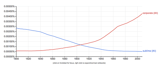 Burke described the Sublime through the prism of philosophy, describing an emotion available to, but heretofore unappreciated by, his countrymen. Burke is hard slogging, as are those who followed up on the theme: Kant, Schopenhauer, Hegel. Just, here’s a thought experiment pushed through Google’s engines. Google has some engine candy called the Ngram Viewer, which charts the popularity of a word as deployed in books over the centuries. Acknowledging the limitations of Ngram Viewer, here’s my little thought experiment: