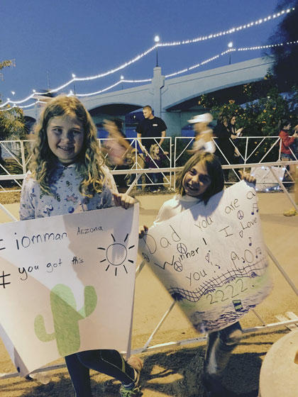 Dan: I was super excited to get running! I got off my bike and felt completely fresh. As I got geared up in T2, I already knew that I had this thing in the bag. I also knew that I would have a chance to finally interact with my family, friends, volunteers, complete strangers, etc. The run was so fun. From the crowds that were cheering nonstop, to the hilarious group of folks that were peddling bacon, and the most encouraging thing was seeing my beautiful daughters holding signs that they had made for me. It was an incredible experience.