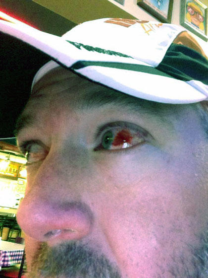 Dan: LOL, you mean my lovely, bright red eye? Yeah, I took a pretty strong elbow to my face that knocked my googles off to the side. My eye started stinging after that. I assumed that it was the baby shampoo that I had put on the lenses that mixed with some of the water that was causing the sting. After finishing the race and seeing the horror show in my eye, it was clear that the elbow was a little stronger than I realized at the time.