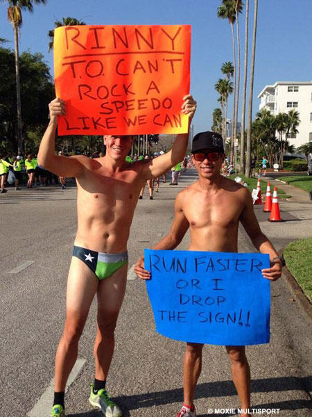 Athletes who are racing hard don't always see all the signs and gestures of fans along the course, but we are pretty sure that Mirinda Carfrae noticed these fans at St. Anthony's Triathlon today. And likely many other racers could not get them out of their mind either.