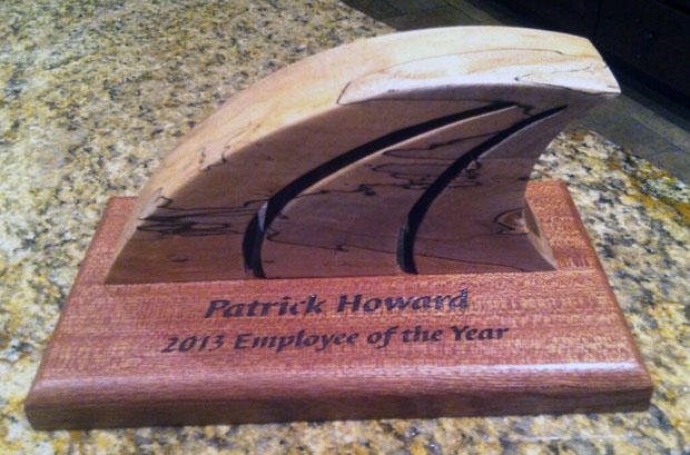 The TriSports crew had their holiday party this weekend and CEO Seton Claggett handmade the employee of the year award for IT guy Patrick Howard. Claggett told us that woodworking is his hobby and when he finally retires and can practice he might be really good. It looks pretty good to us now.