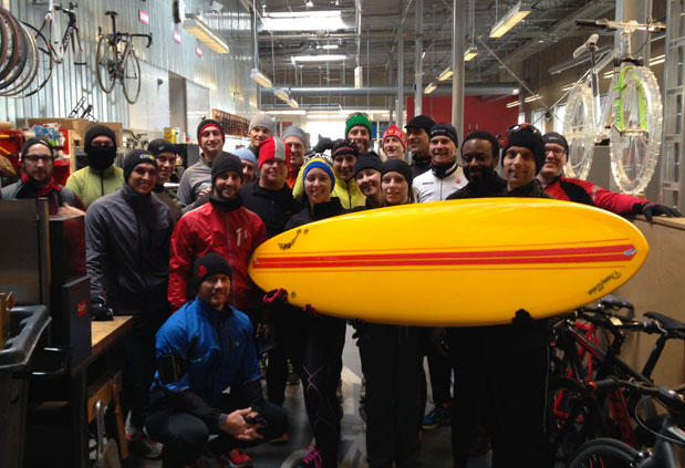 Popular cycling industry veteran Bill Keith passed away a year ago and that shocked friends, co-workers at SRAM and other folks he had previously worked with or had met him along the way. So in honor of Bill Keith more than 20 folks from SRAM went on a BK Fitness Tribute lunch run on Friday and posed with his surfboard before they took off. It was also reported that folks at Cannondale and Campagnolo where he had previously worked also ran, biked and surfed in his honor on that day. Mahalo Bill Keith.