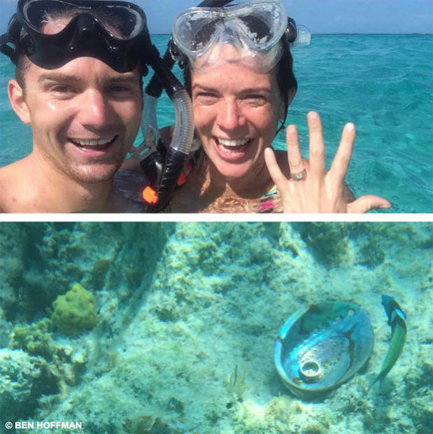 Hoffman appears to be both clever and romantic as he hid the ring in a seashell for Kelsey to discover during a snorkel session in the clear blue Bahamian waters.