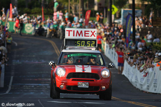 The red and white MINI with the race clock and the Timex logo signals to spectators that the race action is not far behind, and is a great marketing tool for MINI and Timex. Many race reports from the GoPro Ironman World Championships will feature at the very least some glimpses of the car.