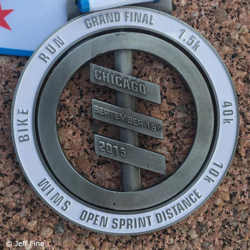 At times is is thrilling to get more than you bargained for, but more is not always better. That is also true for the age group Sprint participants at the WTS Chicago Grand Finals event. When the athletes got the medals around their necks after crossing the finish, they may have noticed longer distances engraved on the medals than they actually did. 1.5k / 40k / 10k and the words Open Sprint Distance. Pic below courtesy of Jeff Fine.