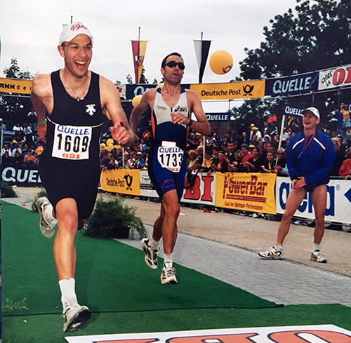 Tim: My first race… Cologne on September 14, 1984 – the day before the first long distance race in European. My dad and the 10 year old me embarked on a journey of a 350 meter swim, 25k on the bike and 8k run. So there was my dad introducing me to the sport. He went on to a Kona AG podium in 1994. But I had not gotten hooked just yet! I only did the occasional triathlon through the 80s and 90s. That Ironman thing though always remained an idea and my best buddy did his first one in Roth in ‘99. And when I had finished law school we both signed up for what turned out to be the last Ironman in Roth 2001. We had a blast. In 2002 they moved Ironman Germany to Frankfurt. At the time I lived barely 100 meters from the run course. I had to do this one, too. A hometown Ironman race – how could I resist? But the real virus only caught on when I got my first coach in 2006 and realized that I had some potential at this. Then I was really hooked.