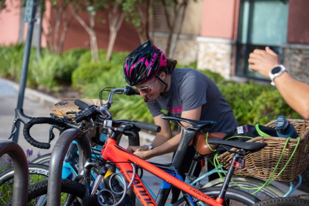 McCauley puts final touches on her Quintana Roo PRSix. One interesting equipment choice is her MORF Tech bar set-up. Late founder, Frank Springett, was a good friend and McCauley dedicated her win at IRONMAN New Zealand to him following his tragic death.