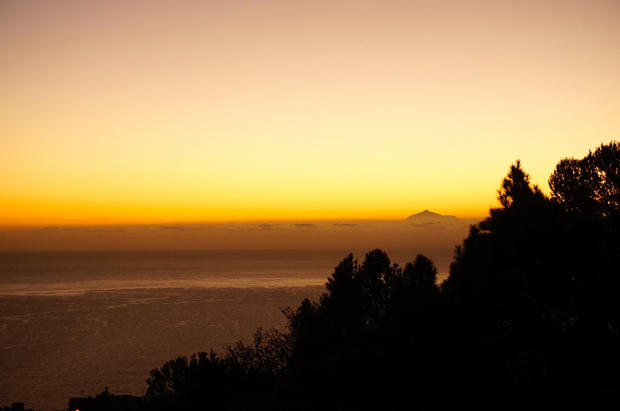 Tenerife’s highest point, the Teide mountain, can be seen on the horizon.