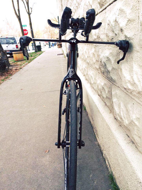 Pat Evoe is fully TriRigged: brakes and bars. If you look at the pads bove the pursuit bar centerline, you see why these bars are the choice for riders looking for lowness beyond, perhaps, what the bike frame grants.
