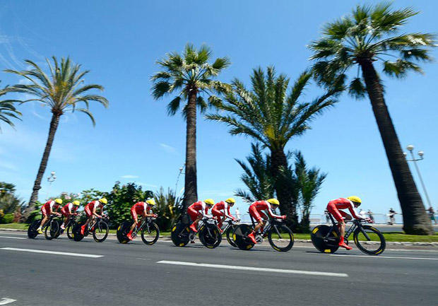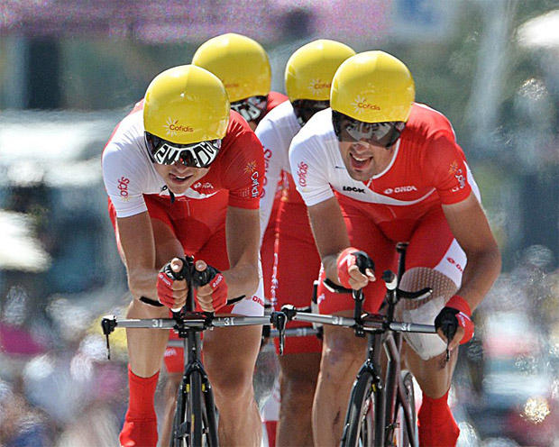 Cofidis rode Look bikes in this photo but now is on Orbea. I don't see any reason why one wouldn't also ride these brakes on Orbea's TT bikes.
