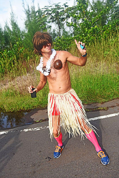 Man in a hula ensemble cheers on the riders at Pahoa.