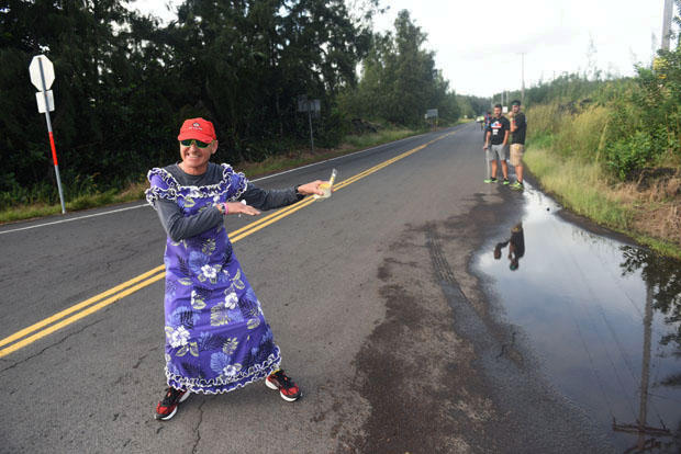 Man sporting the Laura Ashley look cheers on the riders in Pahoa.