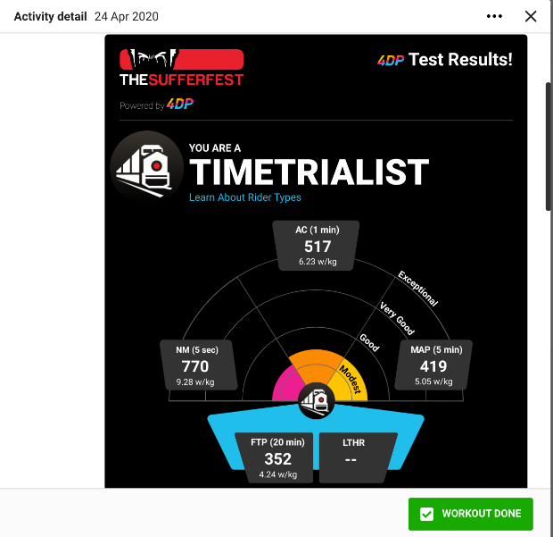 Using Sufferfest’s Full Frontal 4DP test, designed to show riders which areas they are strongest and weakest, I put forth the following efforts after a week without taking AltRed.