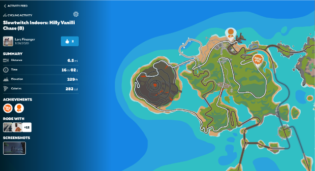 A virtual game of hunter versus the hunted, Hilly Vanilli takes place every Thursday 6pm CST. Riders self-select their group classification based on the watts-per-kilo level they can sustain and are sent off in five minute intervals. D group gets a five minute head start on the C group which gets five minutes advantage on B group. Riders within each group are motivated to work together with the overarching goal to finish together as one big group when time expires.