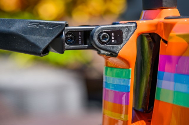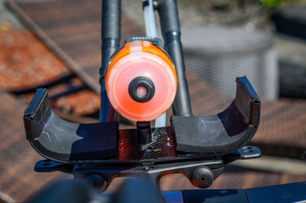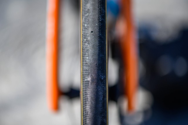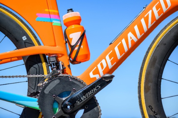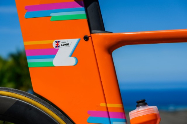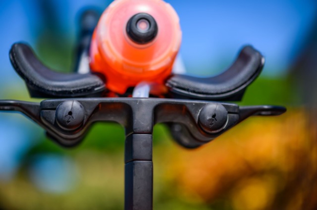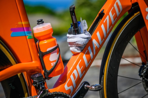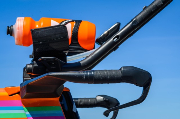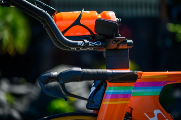 Lunn has a Wahoo ELEMNT Bolt GPS to provide speed, heart rate and power reading easily seen while in his aero tuck. His orange Zwift water bottle sits securely in a XLAB Gorilla bottle cage.