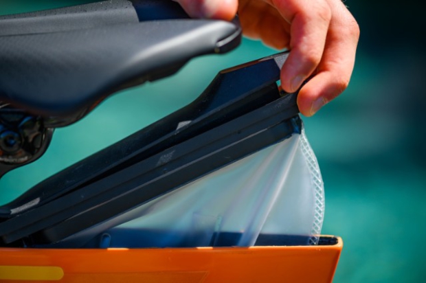The Hydration Fuelcell is hidden from the wind inside the fin shaped foil behind the seat tube.