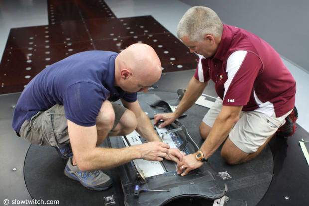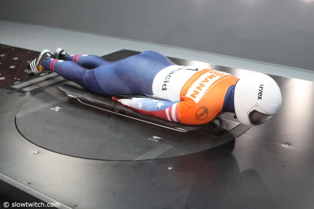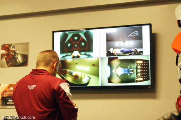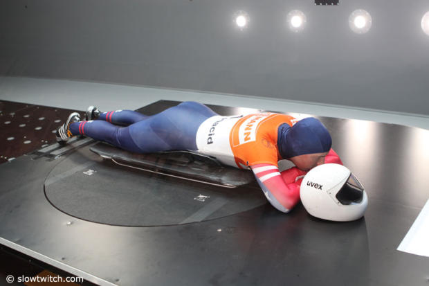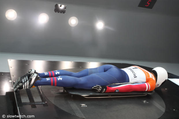 The team brought athletes Matt Antoine, John Daly, Kyle Tress and Katie Uhlaender, 2 coaches and other support folks for a 2-day test and it was surprising to learn that this was the very first time for these athletes of the US Skeleton Team to be in the wind tunnel. Most of the skeleton runs are about a mile in length and take just under a minute so fractions of a second are crucial in this Olympic winter sport.