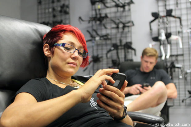 We are not sure how athletes spent time waiting before they had smart phones. Here John Daly and Katie Uhlaender get caught up on the latest.