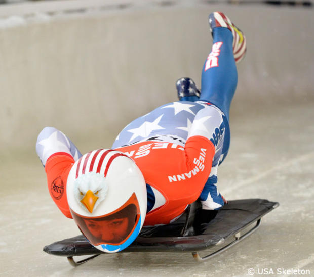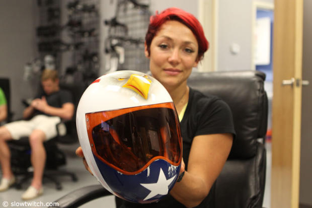 2-time Olympian Katie Uhlaender with her custom painted Uvex helmet. Unlike cycling though, in skeleton racing helmets are virtually standard.